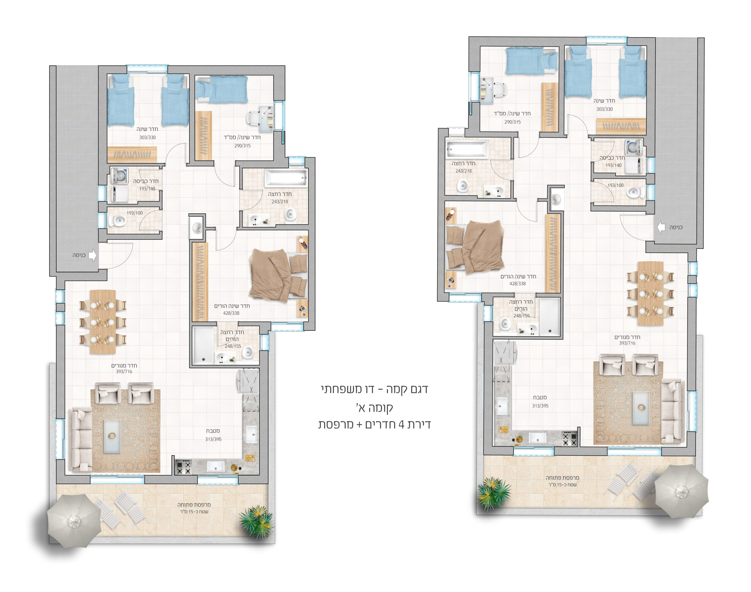 דו משפחתי צמוד קרקע, 5 חדרים, 134 מ"ר + גינה 100 מ"ר פינתי 4 חדרים, 117 מ"ר + גינה 160 מ"ר